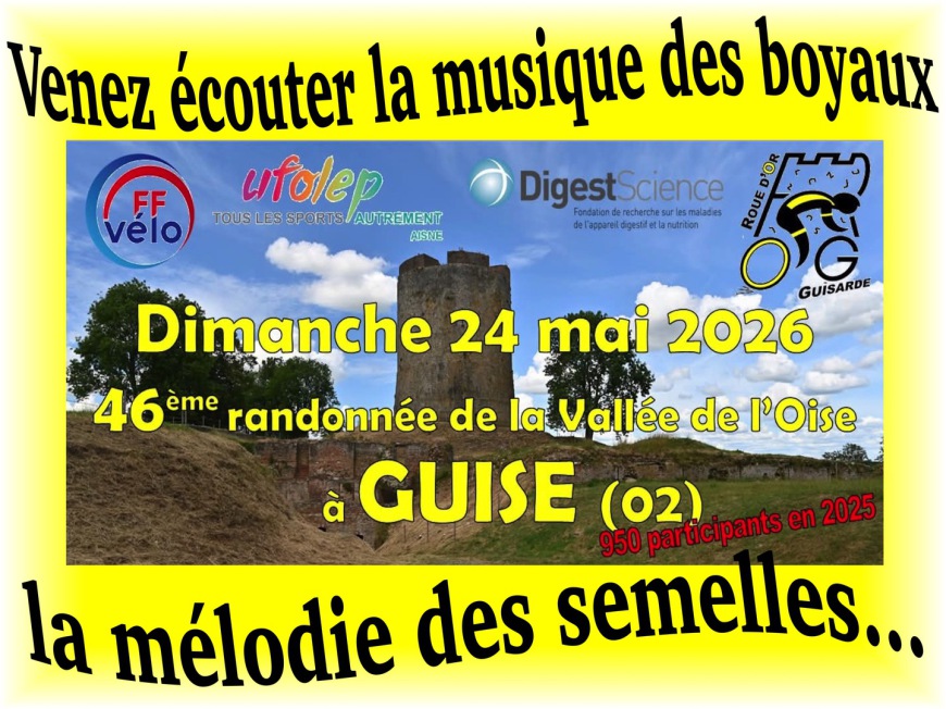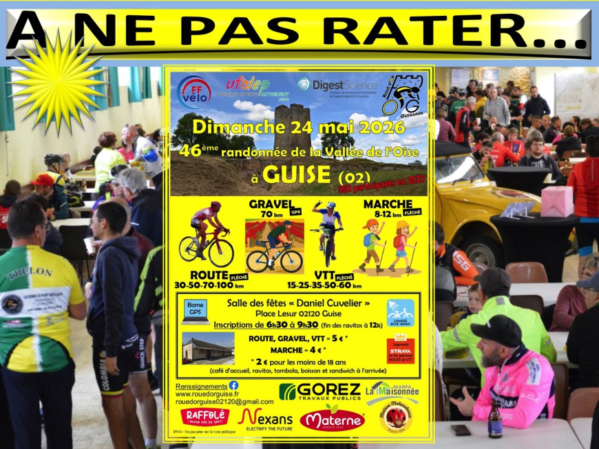 Par ses routes sinueuses vous traverserez ses paisibles villages, enjamberez la vallée de l’Oise en y plongeant d’un côté avec plaisir et gourmandise pour remonter de l’autre avec force pédales, mais avec passion pour vous hisser en surplomb et y admirer un large panorama d’où émergent la sinuosité de l’Oise, des îlots des maisons, des clochers et églises fortifiées avec leurs donjons ronds ou carrés, leurs meurtrières, échauguettes… Toujours, vous voisinerez avec son patrimoine architectural et historique, son bocage et ses cultures... Bref, vous serez sous le charme d’un paysage rural fermement ancré et enraciné ! De quoi satisfaire votre curiosité et ouvrir peut-être votre appétit pour aller déguster un Maroilles et boire un verre de cidre… si le Cœur de la Thiérache vous en dit et que vos pédales restent au vent. Du moins, et en tout cas, de quoi partager en toute convivialité et amitié un sandwich et une boisson (offerts) et participer à une tombola à votre retour à la buanderie du Familistère. LES DETAILS ICI.